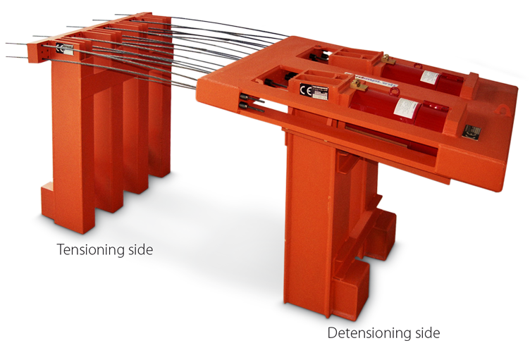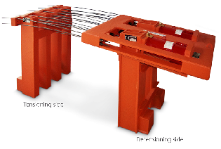 Каждая пара состоит из балки натяжения на одной из дорожек и балки снятия натяжения на другом конце дорожки. Балка снятия натяжения также включает в себя подвижный анкер для отпускания стальной проволоки перед резкой.